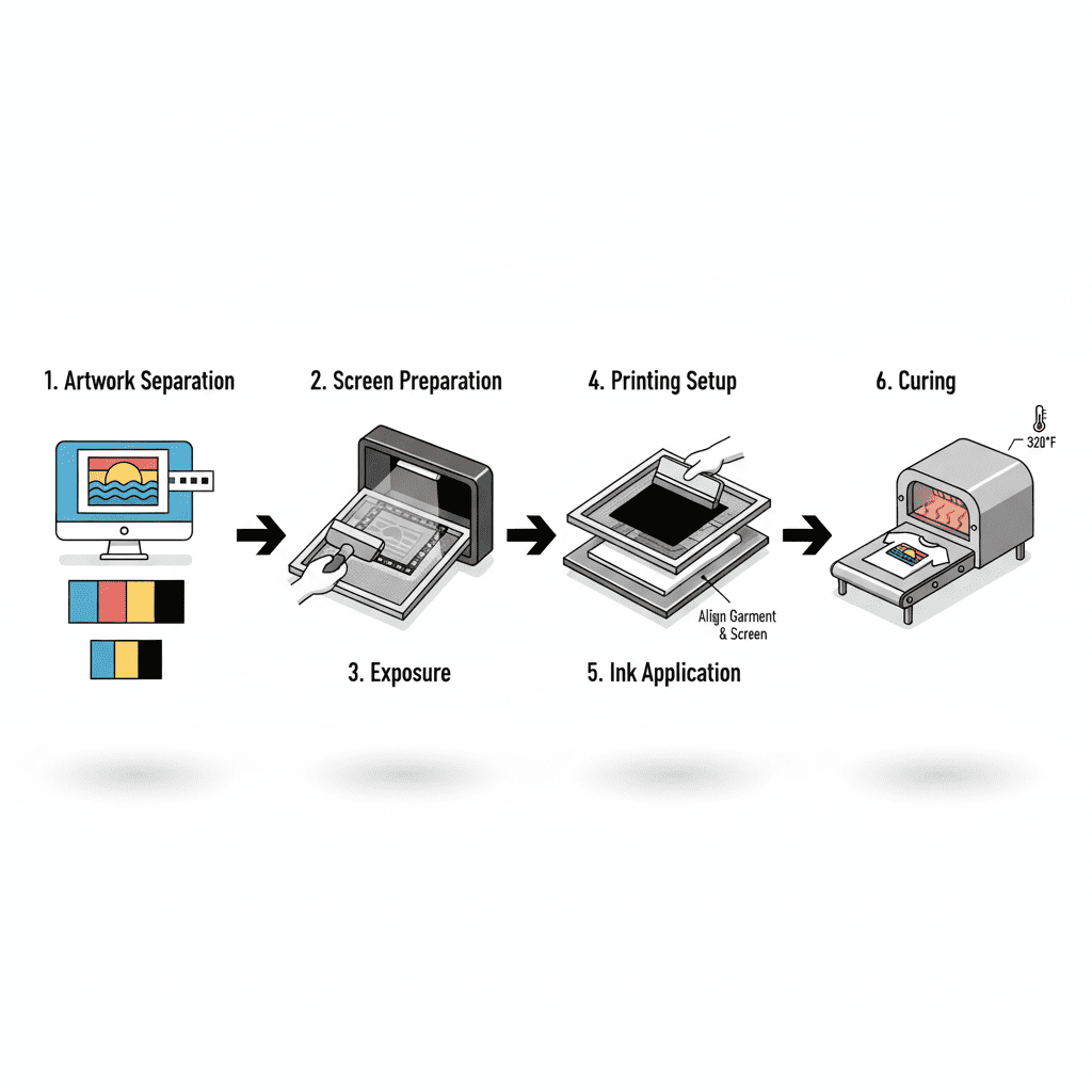 We position garments on printing pallets and align the first screen precisely over the fabric. Squeegees push plastisol or water-based ink through the mesh openings, depositing color directly onto the material. After printing each color layer, garments pass through a conveyor dryer at 320°F, which cures the ink and creates a permanent bond. This heat-curing process distinguishes screen printing from other methods, producing prints that maintain their integrity through years of wear.